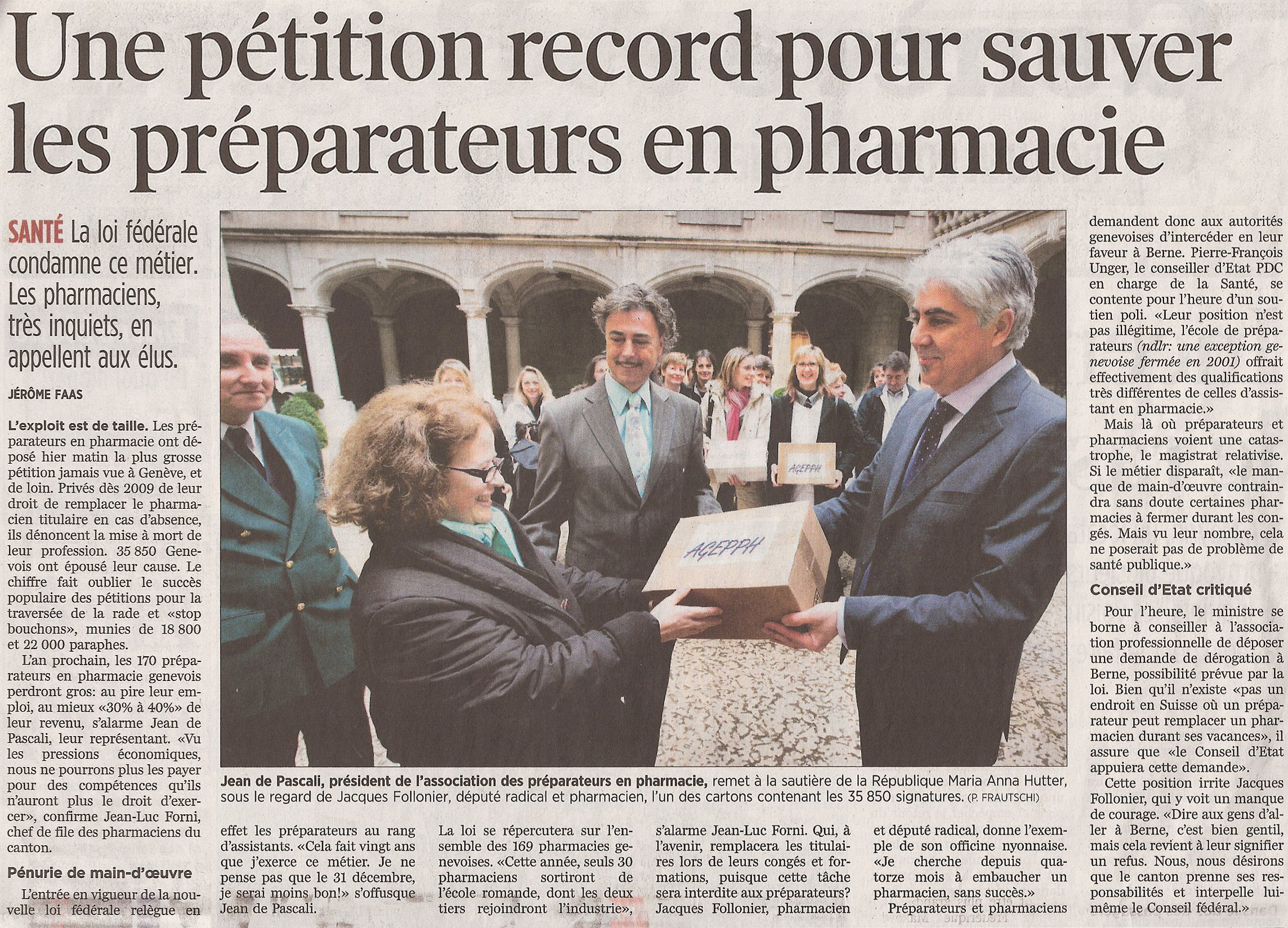 Nous demandons aux autorités genevoise d'intervenir auprès des autorités fédérales, en sollicitant une prolongation de dix ans du moratoire, pour que nous puissions continuer à exercer notre droit de remplacer le pharmracien pendant des périodes limitées. Soutenez-nous en signant noter pétition, afin de pouvoir continuer à vous servir et à vous conseiller.